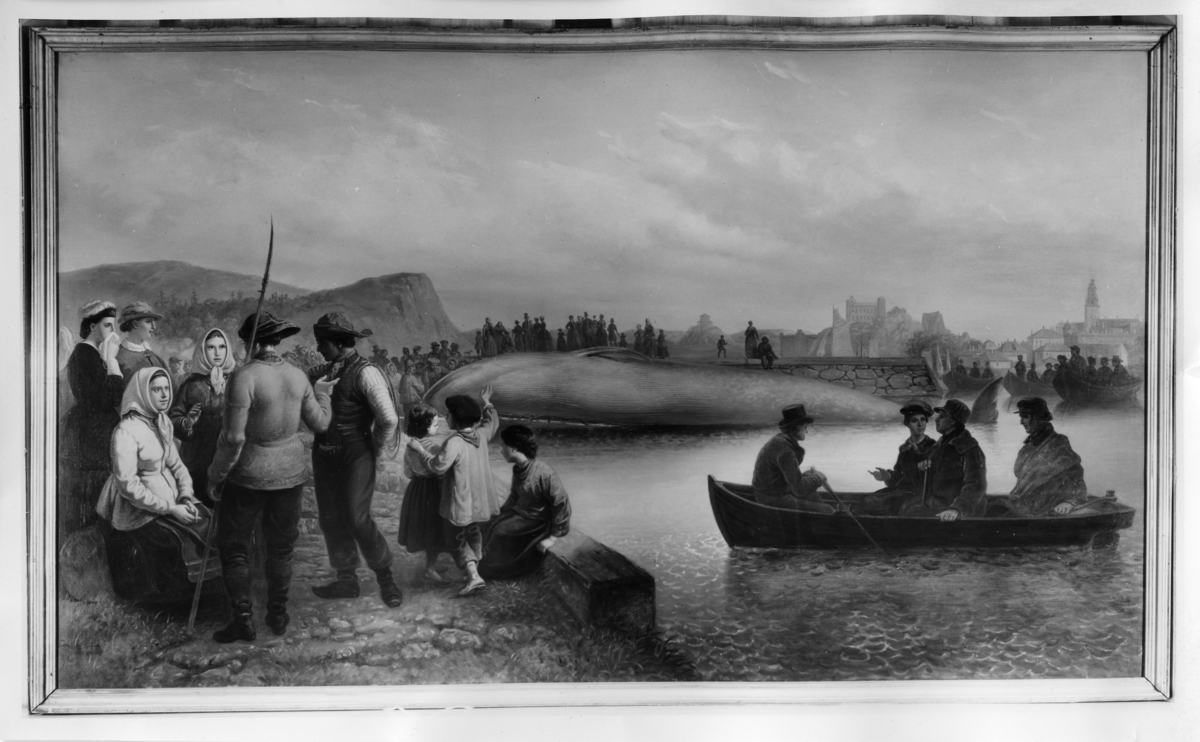 'Bilder på 2 av tavlorna i valsalen. :: :: Valen ligger halvvägs uppe på land.'