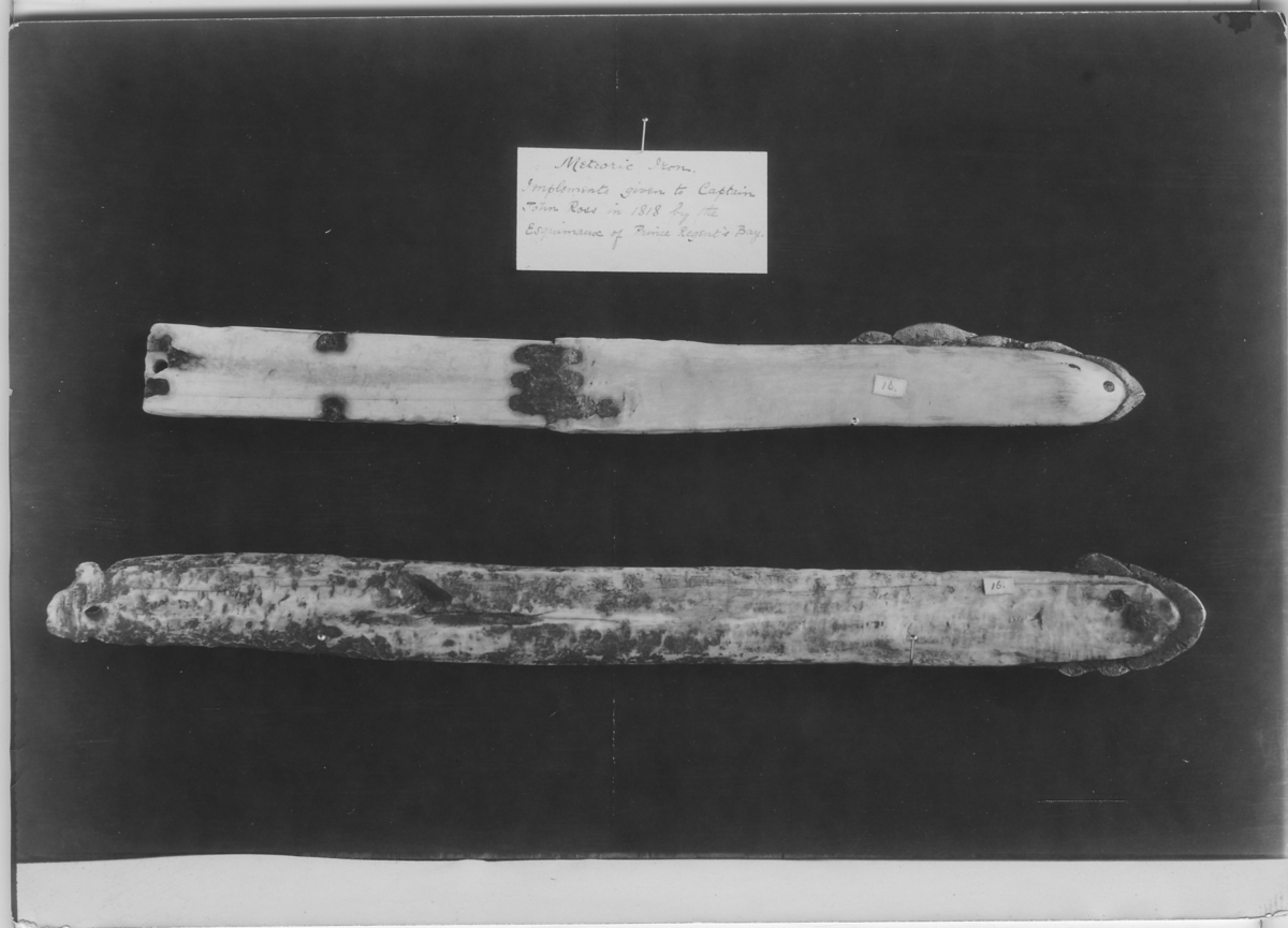 'Div. bilder på ''museala arrangemang av fåglar'', bilderna är insamlade av Leonard Axel Jägerskiöld. :: :: 2 knivformade föremål, enligt atneckning på baksidan av fotografiet: ''Esquimo knives of flakes of meteoric Iron.'''