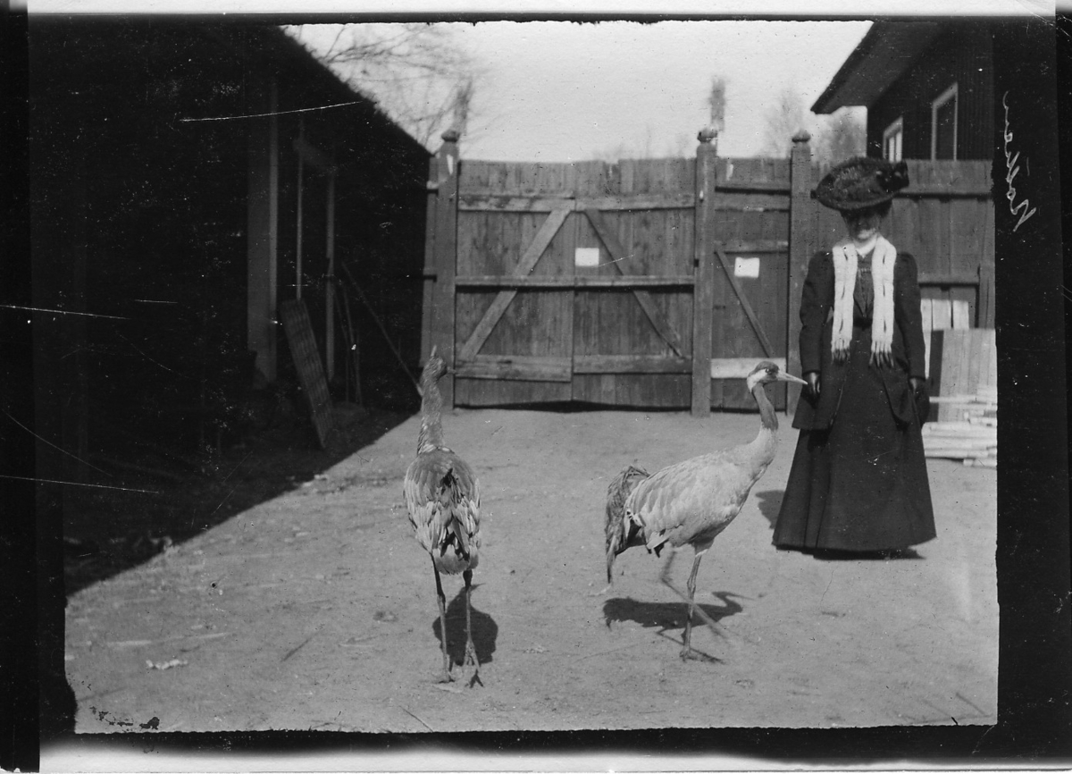 'Bilder från Slottsskogen. :: :: 1 kvinna i hatt och kjol står och tittar på 3 fåglar.'