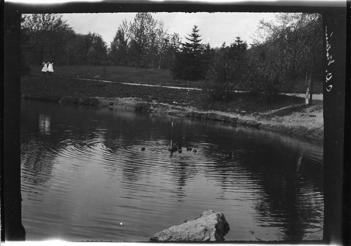 'Bilder från Slottsskogen. :: :: Vattendrag omgiven av växtlighet, vid sidan av står 2 flickor.'
