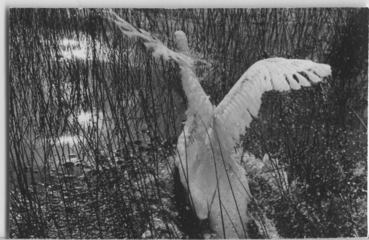 'Svanmärkning. :: Den märkta svanen är släppt fri och beger sig ut i vattnet med vingarna höjda, fotograferad bakifrån, från nära avstånd.'