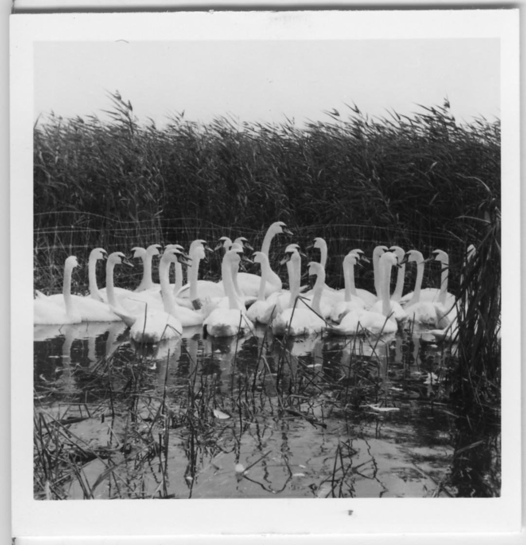 'Svanmärkning. :: Flock med svanar. I bakgrunden stängsel och vass. I förgrunden vatten samt enstaka vasstrån. Fotograferade från avstånd.'