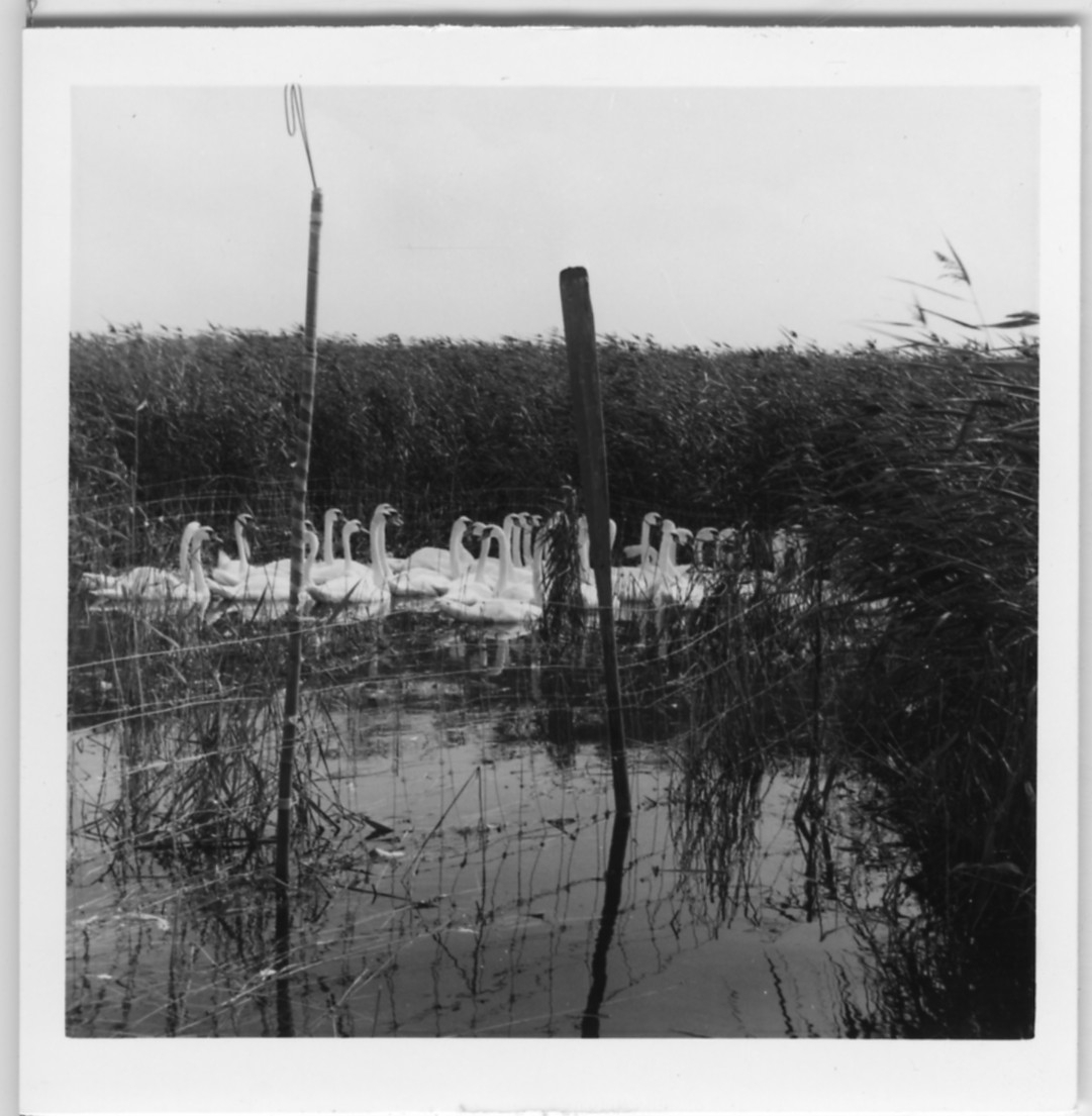 'Svanmärkning. :: Flock med svanar. I bakgrunden stängsel och vass. I förgrunden vatten samt enstaka vasstrån. Fotograferade från avstånd.'