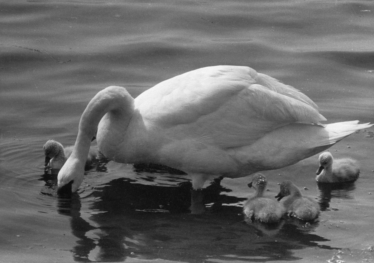 'En i vatten stående knölsvan med huvudet i vattnet. Runt denne simmar fågelungar. På baksidan av fotografiet finns utsuddade anteckningar: ''Vår Fågelvärld, Winge, Fig 2, textbild, För.. Till bild..'','