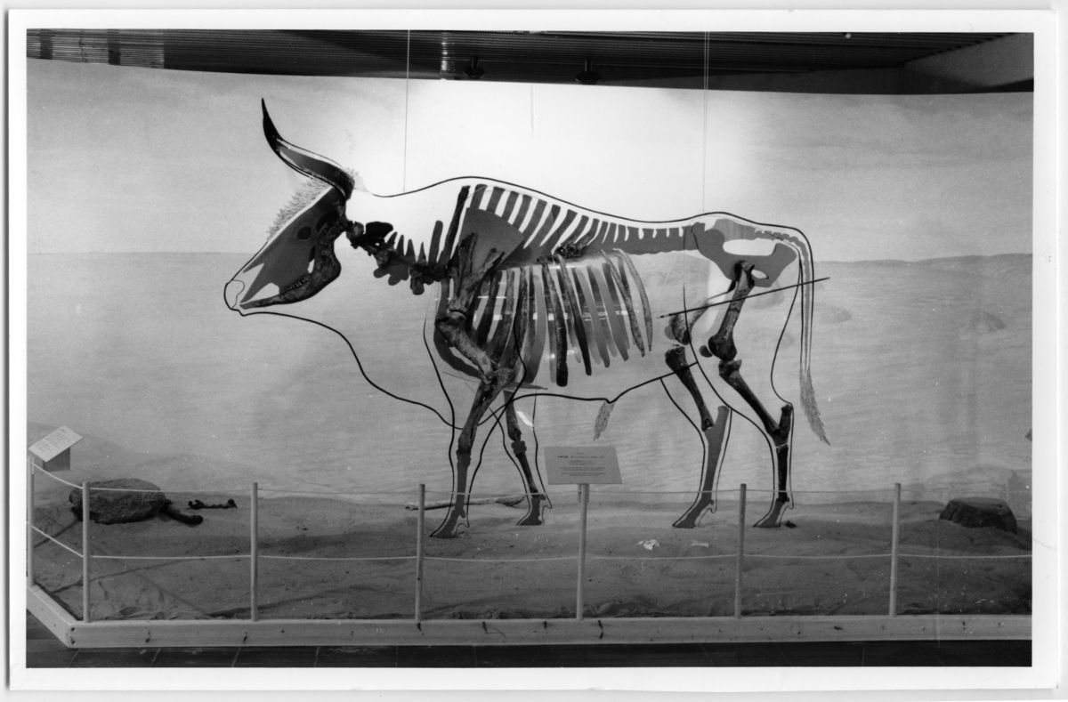'Monterat skelett av uroxen. :: :: Ingår i serie med fotonr. 7102 med bilder tillhörande Svante Lysén, bilderna har lånats och digitaliserats och sedan återlämnats.'