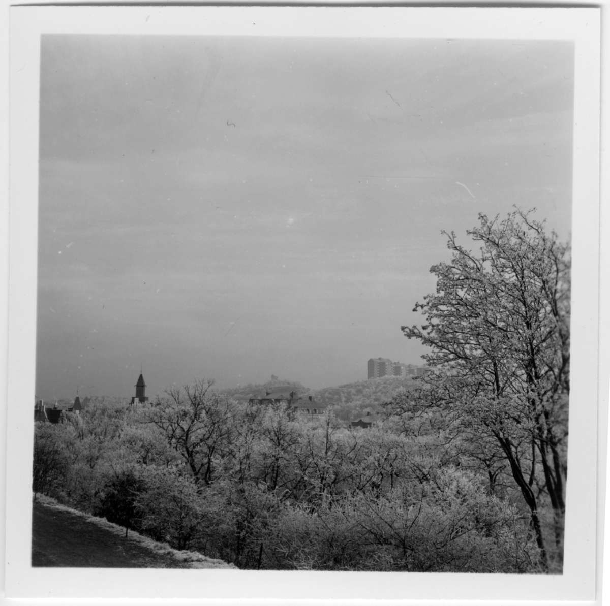 'Vy från Göteborgs Naturhistoriska Museum med Guldheden på höjden till höger och kyrktornet till Vegahemmet synligt till vänster i bilden. Taket till ''Seminariet'' synligt centralt i bilden. :: :: Ingår i serie med fotonr. 7120 med diverse bilder från Hans Lohmander.'