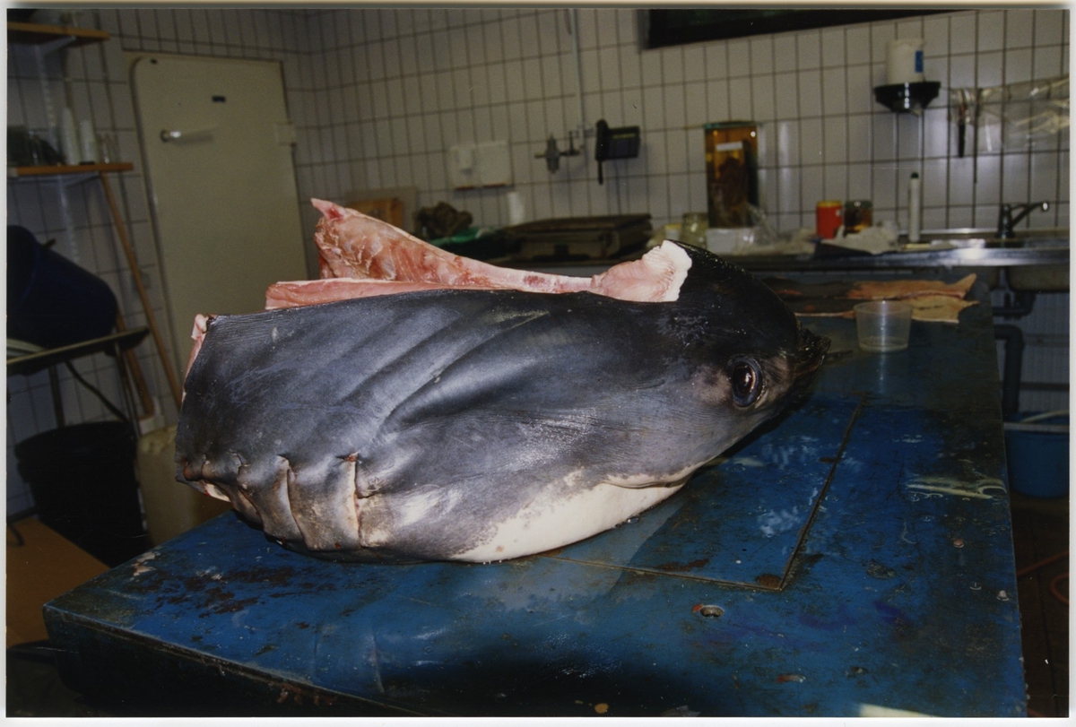 'Rävhajens främre parti, huvud med öga och gälöppningar på sidan. :: :: Ingår i serie med fotonr. 7100:1-13.'