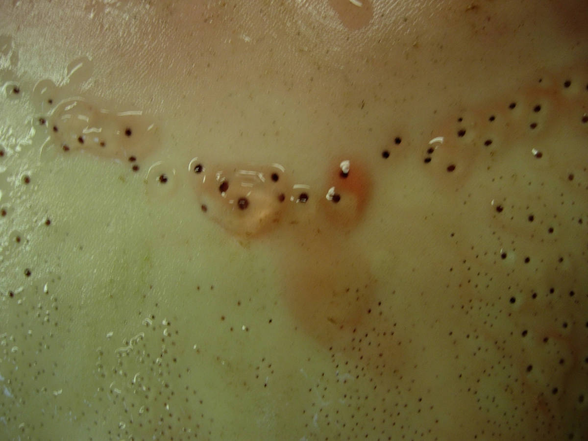 'Arbete med avgjutning av vitspetsad oceanhaj: :: Detaljbild av undersidan, känselorgan, lorenzinska ampuller :: :: Ingår i serie med fotonr. 7108:1-24.'
