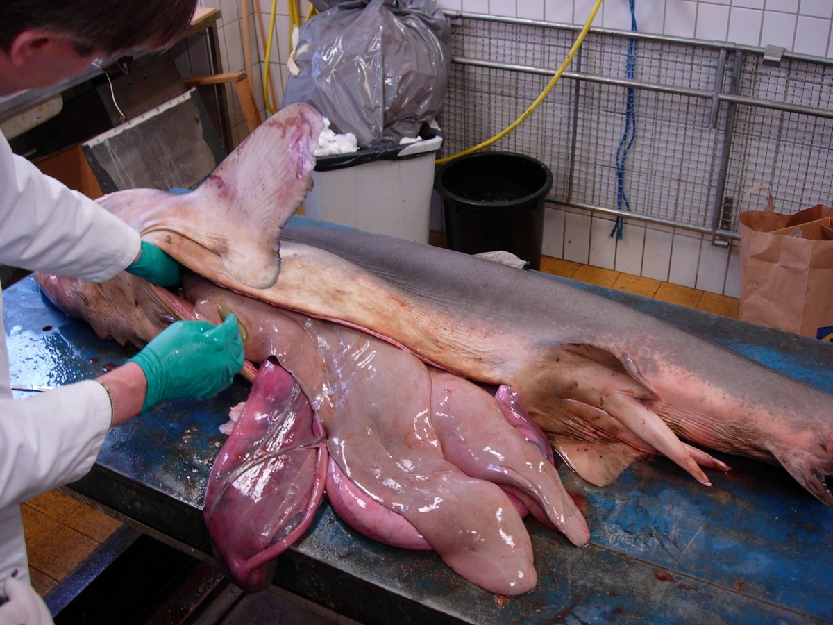 'Arbete med avgjutning av vitspetsad oceanhaj: :: Kroppen tas ur innan den fylls med träull och sys ihop för att sedan fixeras i formalinbad. :: :: Ingår i serie med fotonr. 7108:1-24.'