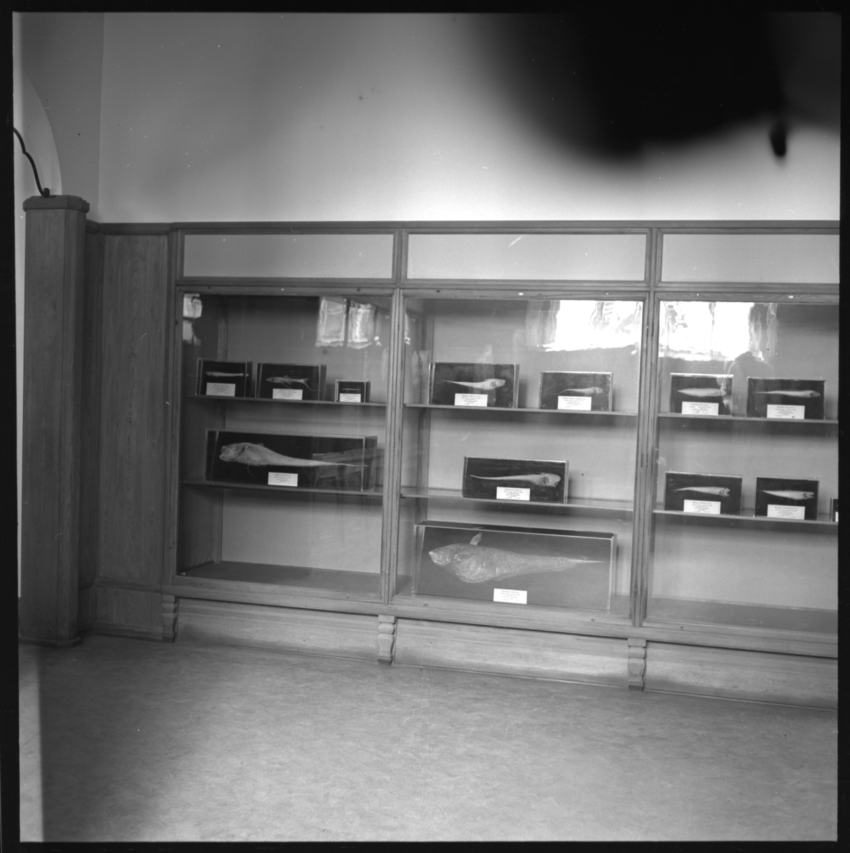 'Del av fiskgången med monterskåp med diverse fiskpreparat i glasbehållare. :: :: Ingår i serie med fotonr. 7120 med diverse bilder från Hans Lohmander.'