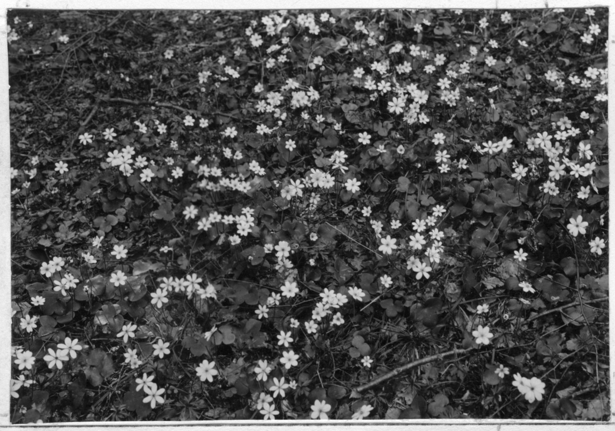 'Bildtext: ''Blåsippor.'' Närbild på fält av blåsippor. :: :: Fotonr. 7046:213-233 indelade som ''Buskar, blommor m.m.'' i Göteborgs län och Bohus län''. Ingår i serie med fotonr. 7046:1-383, 7047:1-33 och 7048:1-67 med bilder från Länsjägmästare John Lindners bildarkiv.'