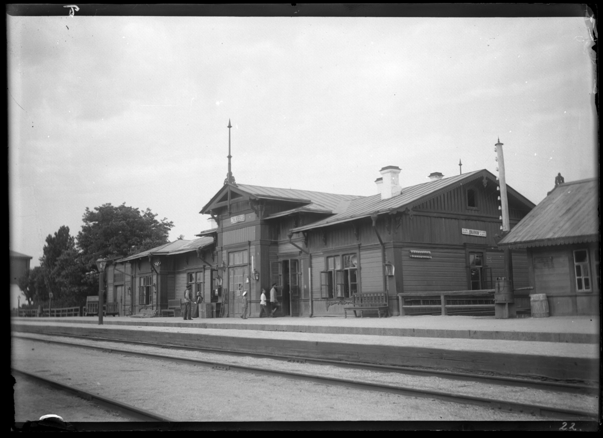'Vy med järnvägsspår i förgrunden och troligen tågstationshus, stationsbyggnad i trä med människor, barn, kvinnor, män, framför. Kläder. Klädsel. Bänk. :: :: Ingår i serie med fotonr. 5287:1-22. Se även fotonr. 5269-5292 med bilder från Stuxbergs resa till Kaukasien.'