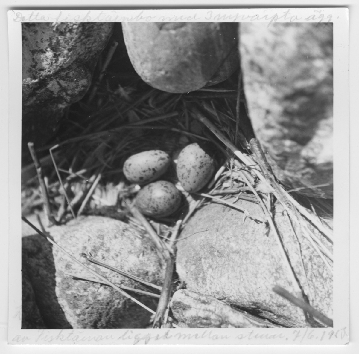 'Bo med 3 st ägg av fisktärna invid stenblock. :: :: Text på fotot: ''Detta fisktärnebo med 3 st nyvärpta ägg av fisktärna ligga mellan stenar. Kolonin bestod av 6 par.'' :: :: Ingår i serie med fotonr. 4545:1-34.'
