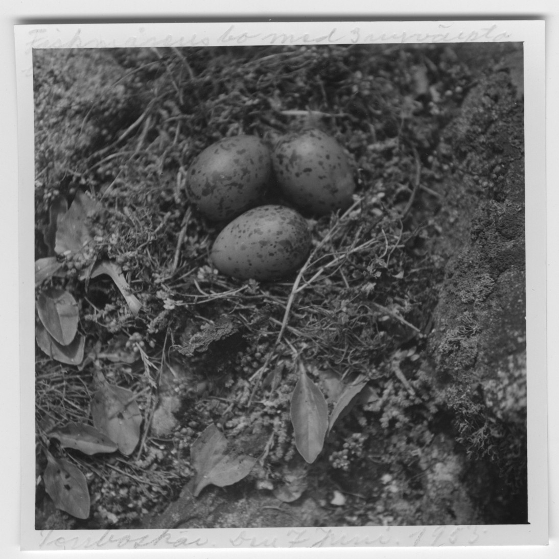'Bo med 3 ägg av fiskmås. :: :: Text på fotot: ''Fiskmåsens bo med 3 st nyvärpta ägg på en äng i mitten på Touboskär.'' :: :: Ingår i serie med fotonr. 4545:1-34.'