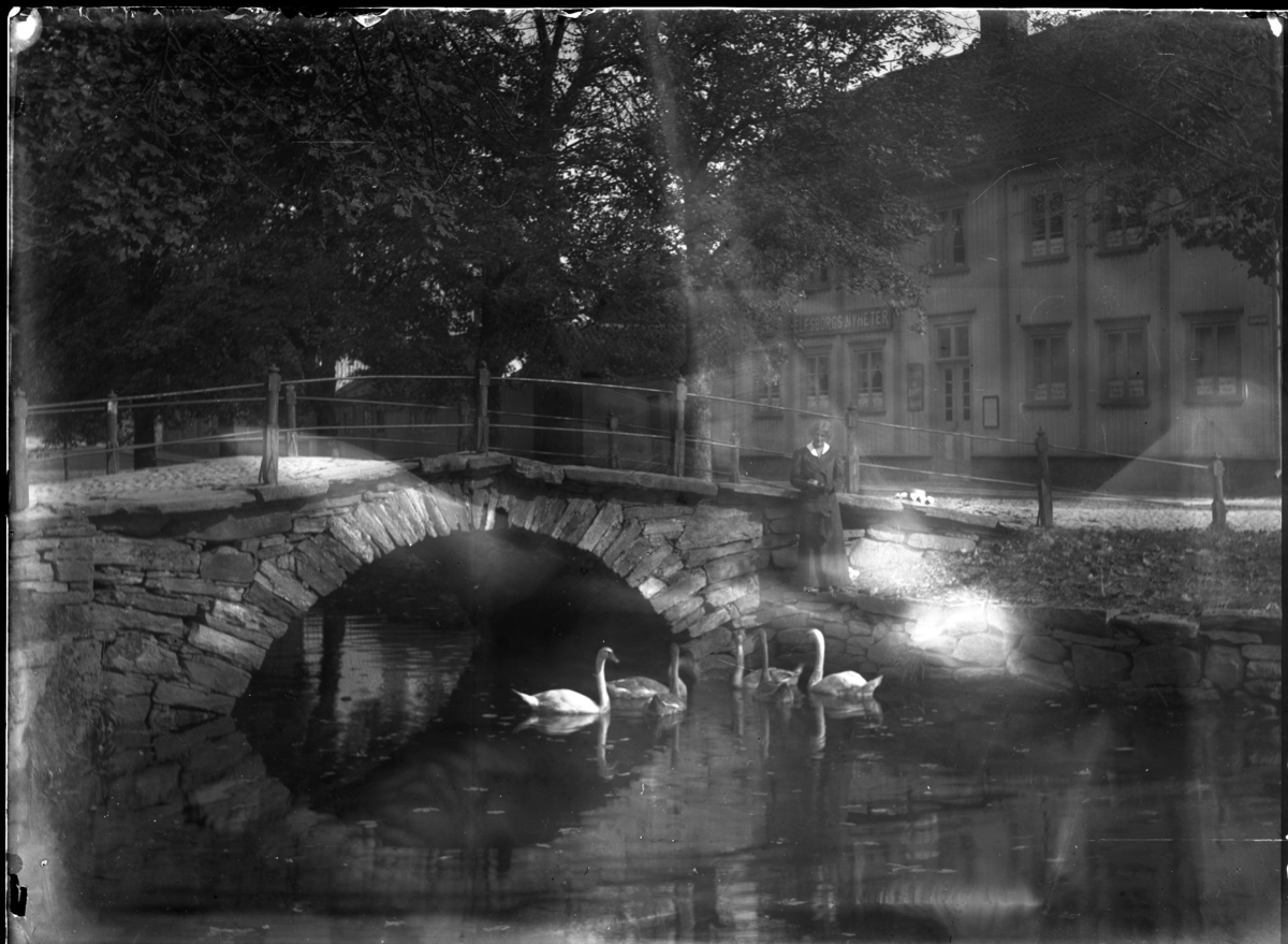 'Vy med stenbro, vattendrag och 6-7 svanar som simmar i vattnet. 1 kvinna stående nere vid vattnet intill stenbron. Staket uppe på brons båda sidor. Elfsborgs nyheter står på en skylt på byggnad i bakgrunden. Se även fotonr. 5140:11 och 18, troligen samma plats. :: :: Ingår i serie med fotonr. 5140:1-39.'