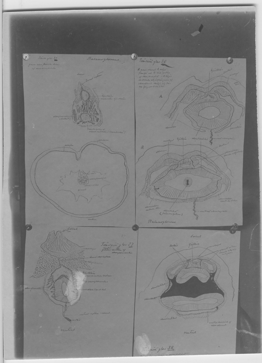 'Teckning av preparat på glas. Illustration av olika tvärsnitt av ollonet hos Balanoglossus. . :: På baksidan står Kerstin Nyblén V.T. -18 :: :: ''Fotografier använda vid dissektionskursen våren 1928'' . :: Avfotograferade teckningar på skelett och organ. :: På baksidan av vissa står det Kerstin Nyblén :: V.T.-18 :: , Preparat, ur bok'