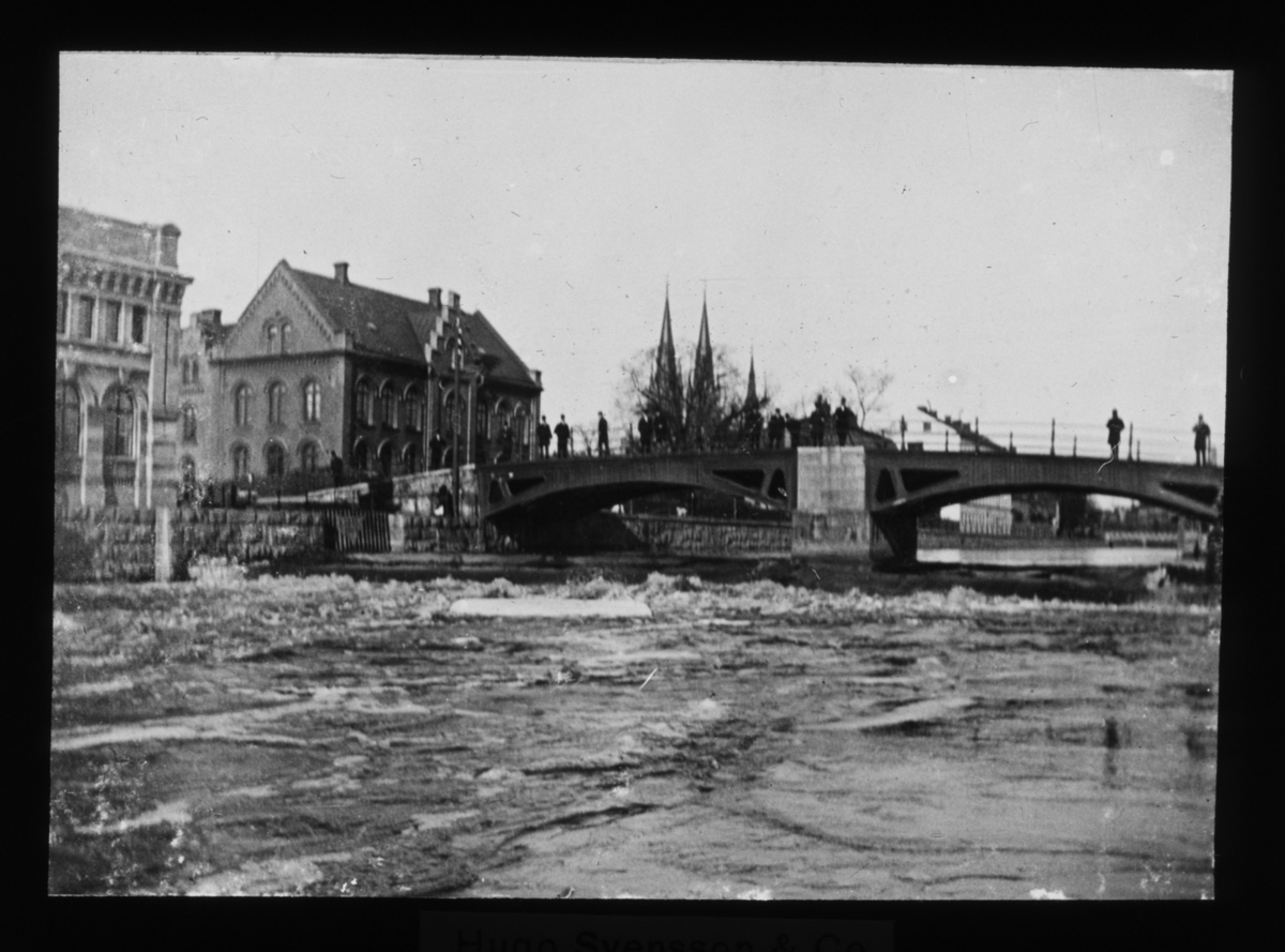 'Vy med stora hus, kyrktorn och bro över flod. Människor stående på bron, iakttar något i vattnet. :: :: Ingår i serie med fotonr. 5215:1-6. Se även hela fotonr. 5202-5218 med bilder från Frits Johansen.'