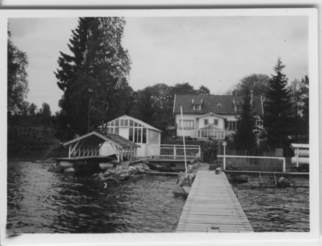 'Biologiska föreningens utfärd till Växjö, Aneboda och Misterhult: :: :: Vy upp mot ett hus, brygga och båtskjul i förgrunden. :: :: Se 3902-3908, 3909-3923 samt 3924-3933 från samma utfärd.'