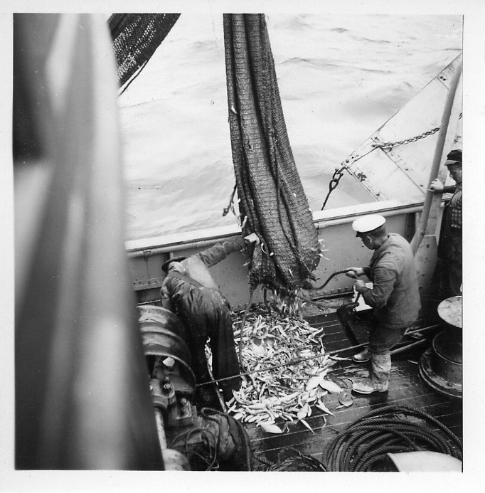'Från Göteborgs Biologiska förenings expedition med ''Skagerak'': :: :: Silltrålen tömms. :: :: Ingår i serie med fotonr. 3934-3953 med foton från Göteborgs Biologiska förenings expeditioner.'