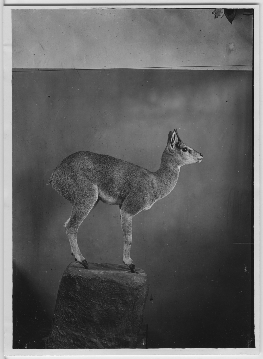 'Klippspringare, sedd snett framifrån. Fynddatum: 1910-06-30. Coll.an.4666. :: Gen.kat.nr. 1911-1966. :: :: Montaget finns utställd i däggdjurssalen i monterskåp nr. 49 på Göteborgs Naturhistoriska Museum (2007-10-31). :: :: se även fotonr. 4248:2.'