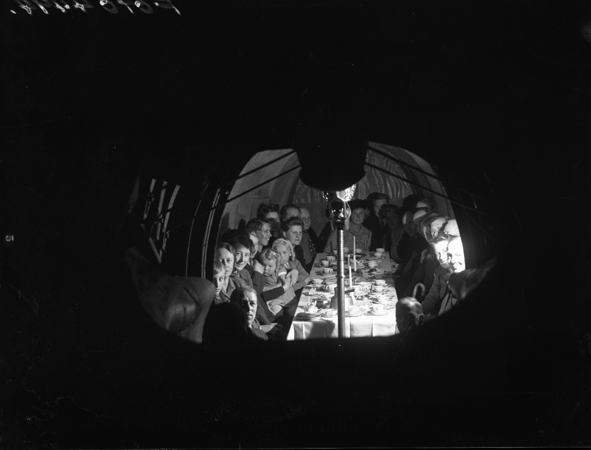 Kafferep i Malmska valen. Knappt 25 personer, män, kvinnor och barn sittande längs valens insida, på bänkar. Sittande vid dukat bord med kaffeservis.
