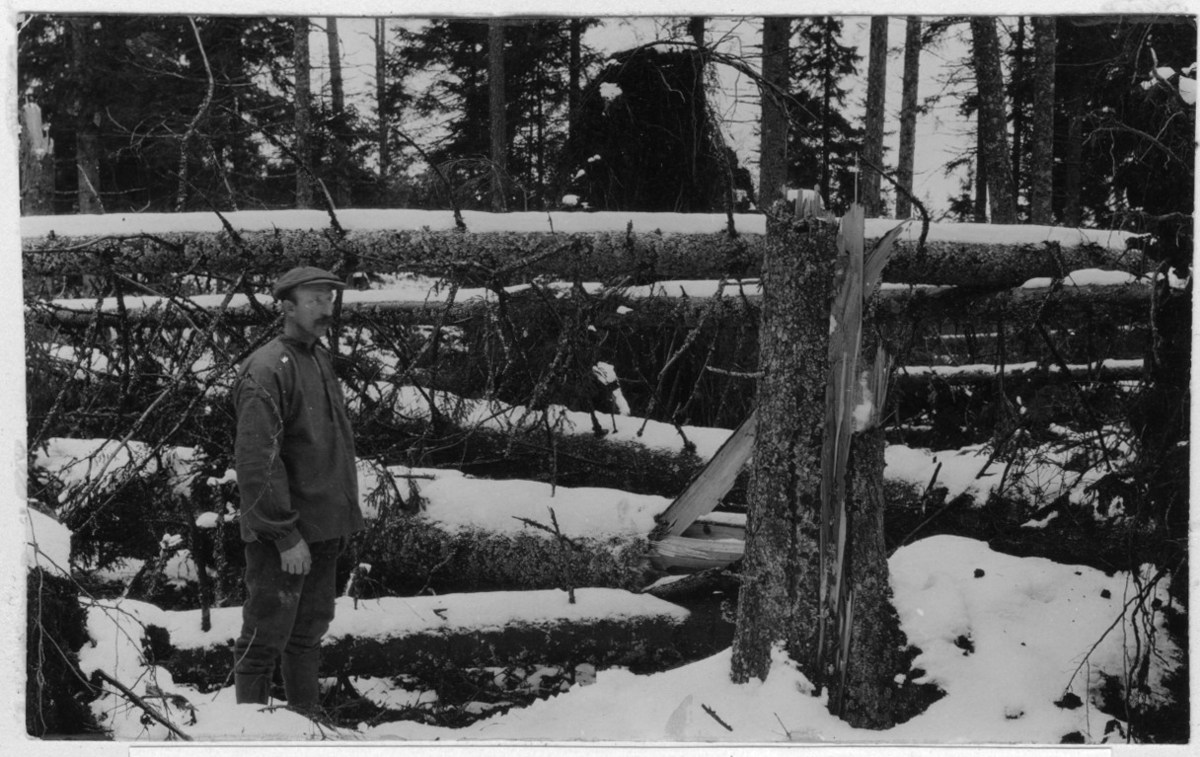 'Bildtext: ''Efter snöstormen den 23 oktober 1921.'' Närbild av 1 man stående intill avbrutna stammar av barrträd. :: Hög med liggande stammar. :: :: Fotonr. 7047:2-23 indelad under rubriken ''Atmosfäriska skador på skogen, skogseld och släckning därav.'' Ingår i serie med fotonr. 7046:1-383, 7047:1-33 och 7048:1-67 med bilder från Länsjägmästare John Lindners bildarkiv.'