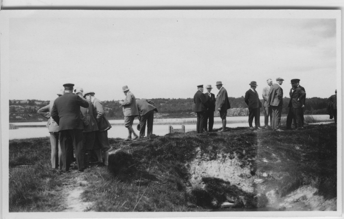 'Göteborgs Biologiska föreningens utfärd till Bullaren: :: :: 15-tal män vid fiskedammarna vid Svankällan Fiskodling. :: :: Ingår i serie med fotonr. 2088-2096.'