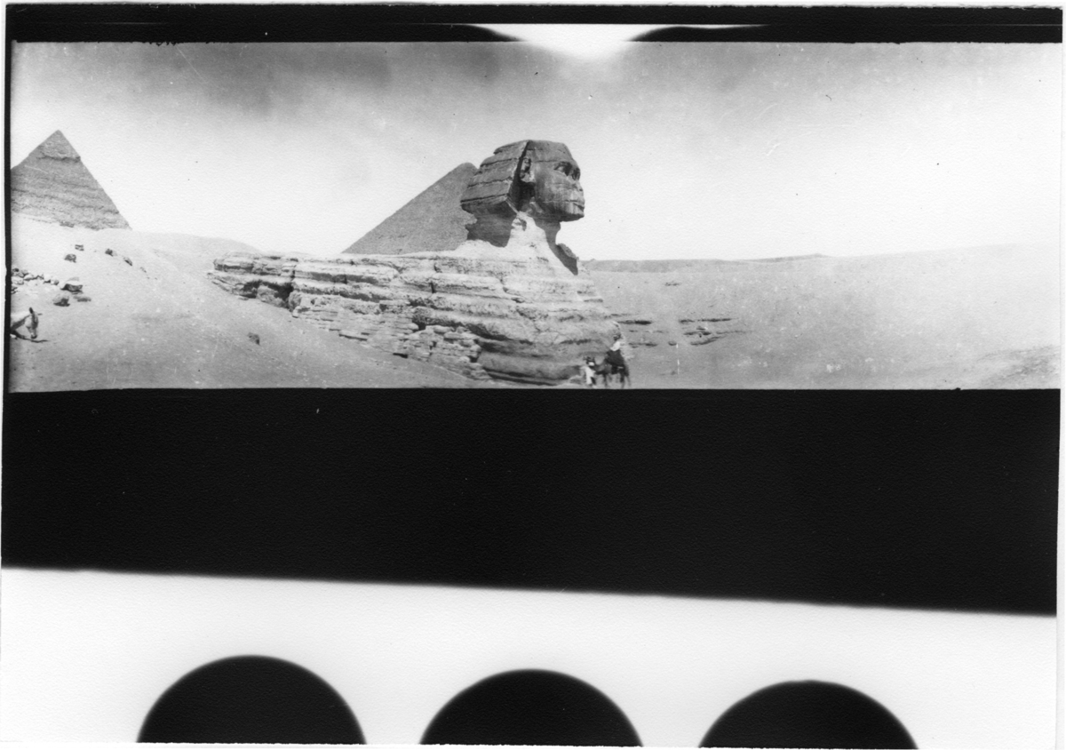 'Diverse fotografier från bl.a. dåvarande Nordrhodesia, nu Zambia, tagna av Konsul Magnus Leijer. :: :: En kvinna på en dromedar(?) invid en sfinx och 2 pyramider.'