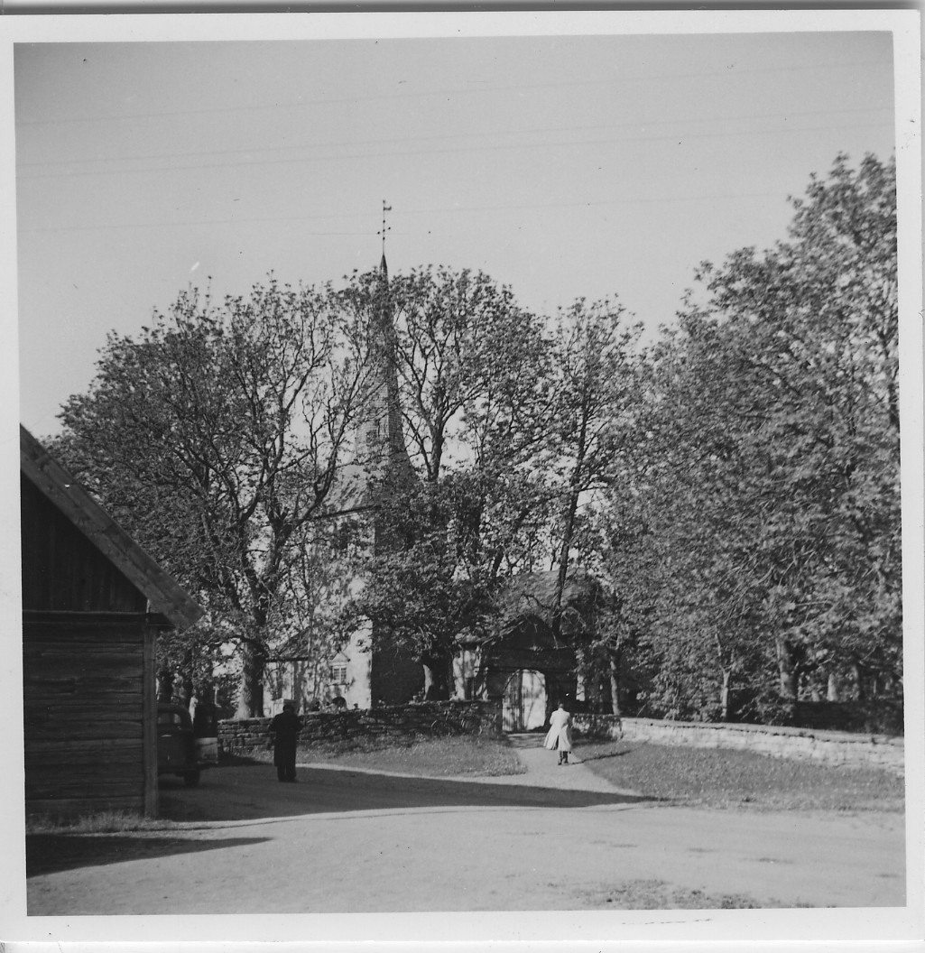 'Ingår serie 4385:1-27 från Biologiska föreningens utfärd till sjön Östen och Kinnekulle. :: :: Västerplana kyrka (Jungfru Maria kyrka, 1100-tal), från kyrkoplanen. Några personer framför kyrkan.'