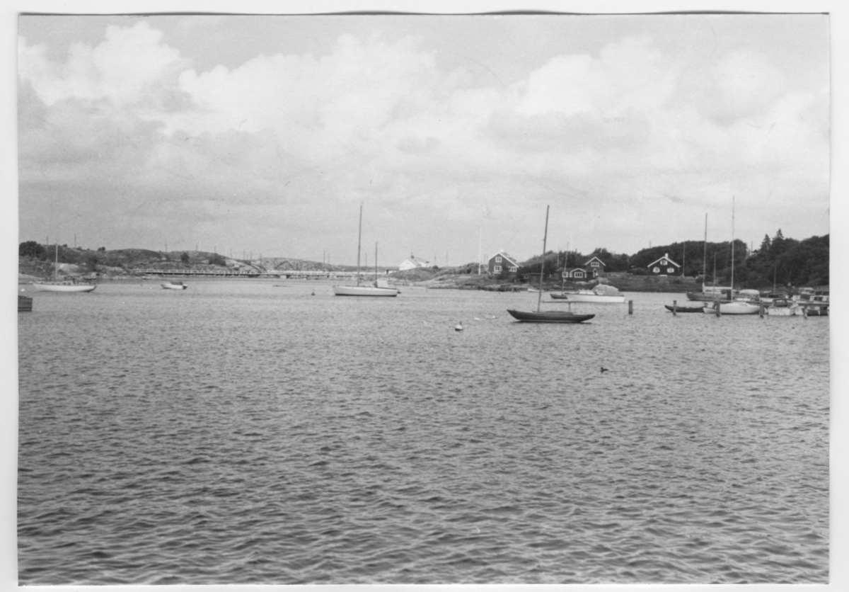 'Bildtext: ''Sund. Riktning 330.'' Vy över sundet med båtar i vattnet, ca 5 hus på land. :: :: Ingår i serie med fotonr. 6970:1-1125, dokumentation av Hisingens naturgeografi, visande landskapsformerna i stora drag och gjord inför exploateringen av området. Platserna för fotograferingen finns utsatta på karta i skala 1:4000 som finns på Göteborgs Naturhistoriska musem. Fotoriktningen mättes med kompass i gammalgrader.'