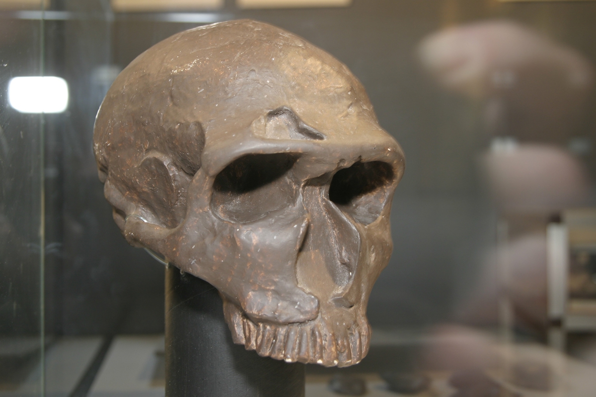 'Närbild på modell av kranium av neanderthalmänniska. :: :: Ingår i serie med fotonr. 7000:1-7 med foton tagna på utställningen ''Neanderthal-människan 150 år'' som stod på Göteborgs Naturhistoriska museum 15 november 2006 till 15 mars 2007.'