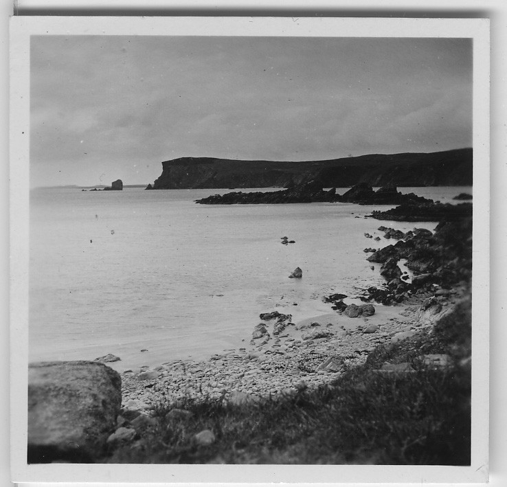 'Från ''Skageraks''-expeditionen till Hebriderna och Shetland: :: :: Vy över hav och strand med udde i bakgrunden av bilden. Klippor. Blockstrand. Samma motiv som fotonr. 4113:11. :: :: Ingår i serie med fotonr. 4111:1-43.'