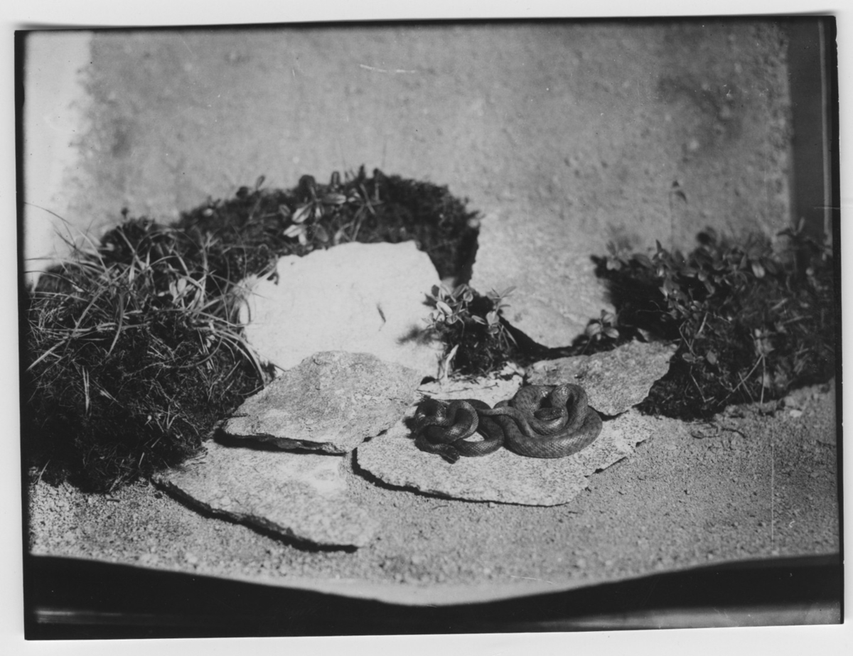 '2 exemplar av rutsnok liggande vid några stenblock. Den vänstra från Janninasjön, Epirus, Grekland och den högra från Thermopylae. :: :: Ingår i serie med fotonr. 4501:1-60 ur ingenjör Otto Cyréns ''Ormar i fantasi och verklighet''. Bilden med på s. 148 i verket.'