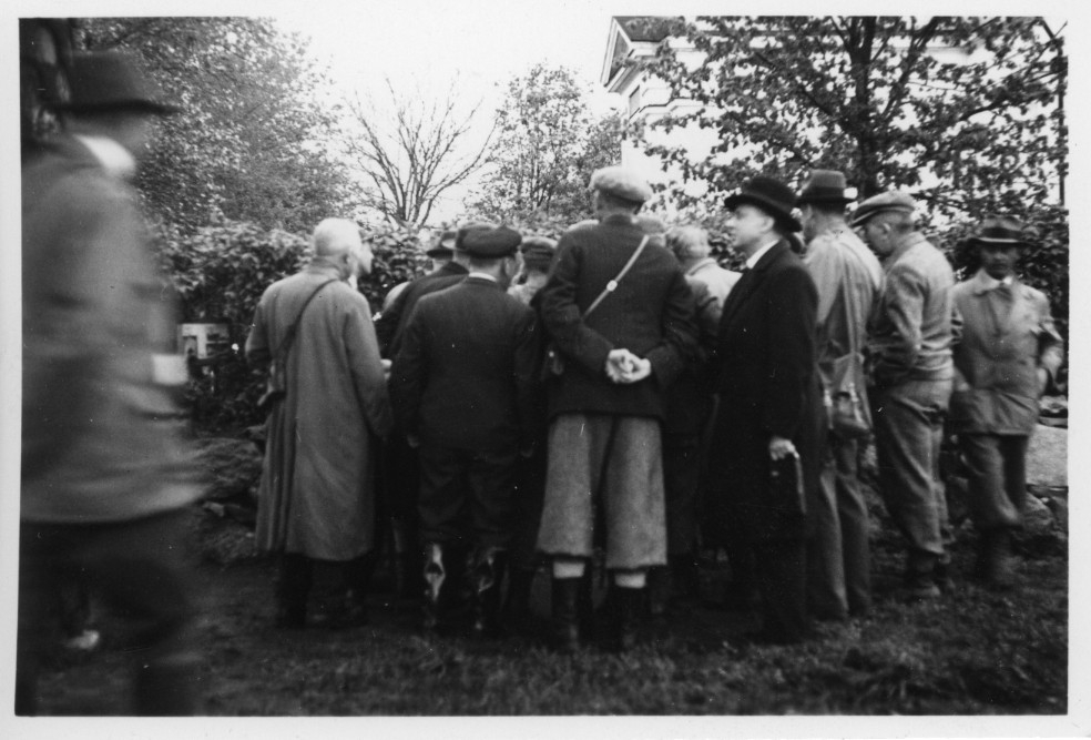'Biologiska föreningens utfärd till Tåkern, Vadstena m.fl. platser: :: :: Ca 15 personer samlade kring något som studeras, ryggtavlorna synliga. I bakgrunden byggnad. :: :: Se fotonr. 3588-3634 samt 3661-3677.'