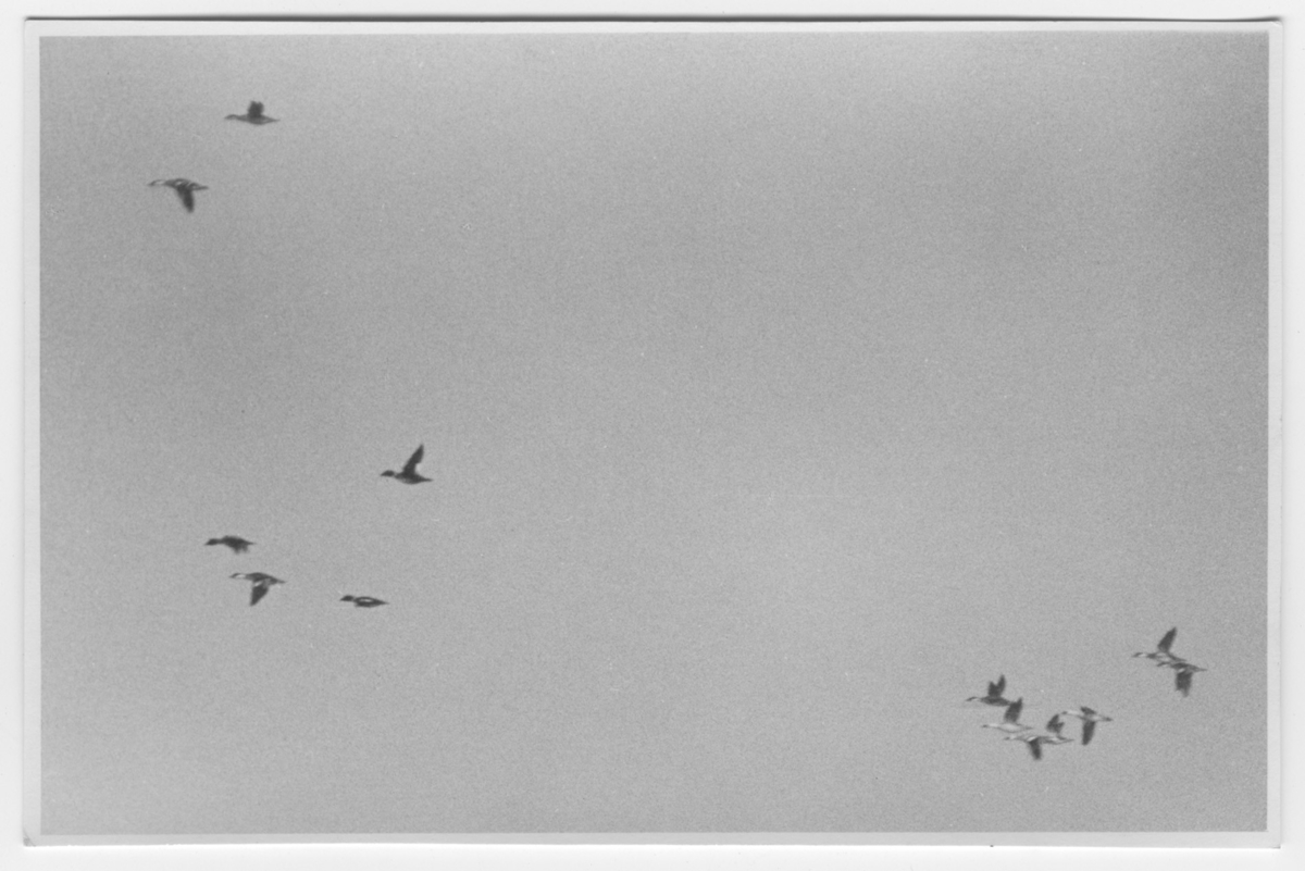'Enligt text på baksidan av fotot: 10 st salskrakar varav 3 st är gamla hannar i praktdräkt och 3 st knipor nederst till vänster, i flykt. :: :: Ingår i serie med fotonr. 2098-2115.'
