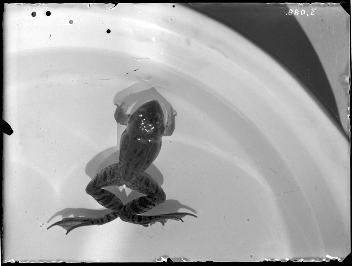 'Vanlig groda under parning i labb, med kroppen utsträckt. :: :: Se serie med fotonr. 3082-3090.'