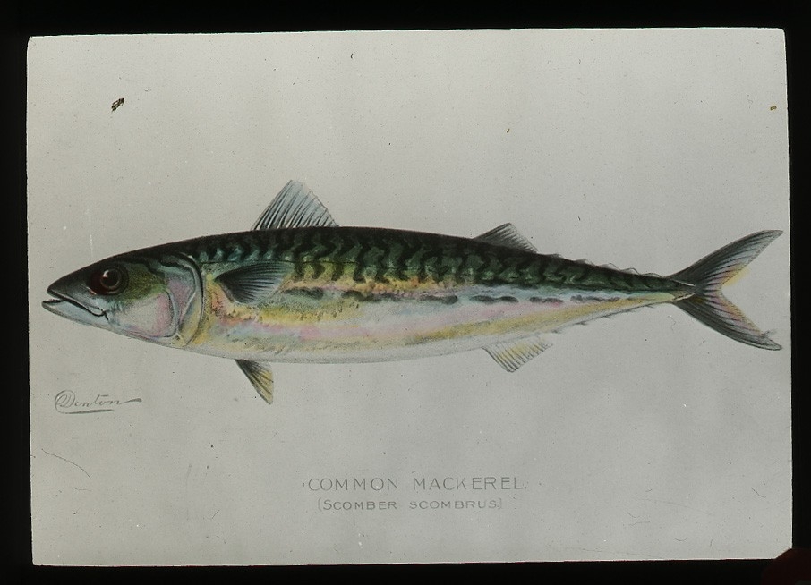 'Illustration av 1 st makrill. Text under bilden: ''Common makerel. Scomber scombrus.'' Text på glaset: ''Natural resources intelligence branch.'' :: :: :: Ingår i serie med fotonr. 5205:1-20. Se även hela fotonr. 5202-5218 med bilder från Frits Johansen.'