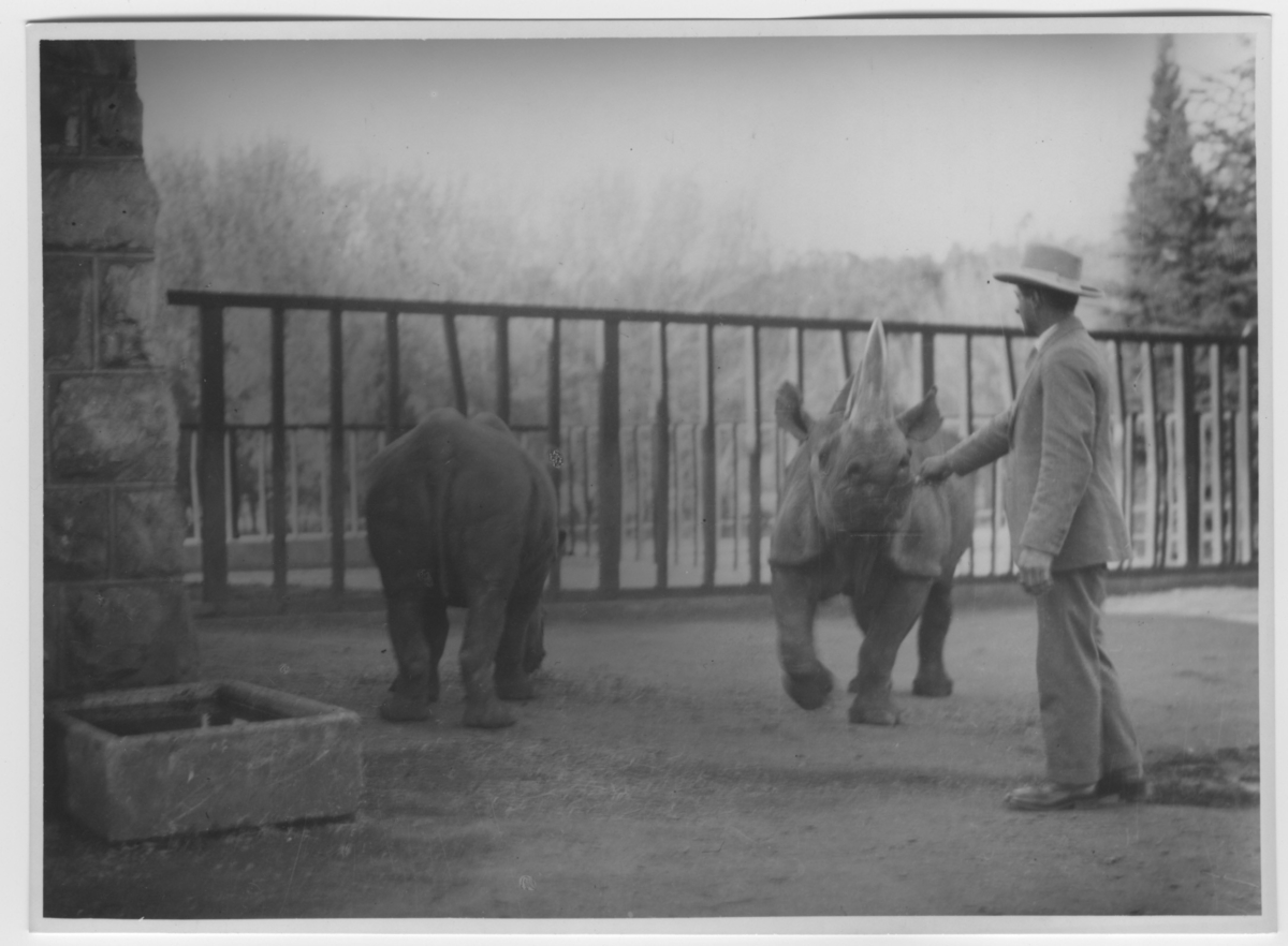 '2 st noshörningar i Johannesburg djurpark Den till vänster är samma som fotonr 4337:1, en man inne hos noshörningarna. Staket i bakgrunden. :: :: Ingår i serie med fotonr. 4337-4348.'