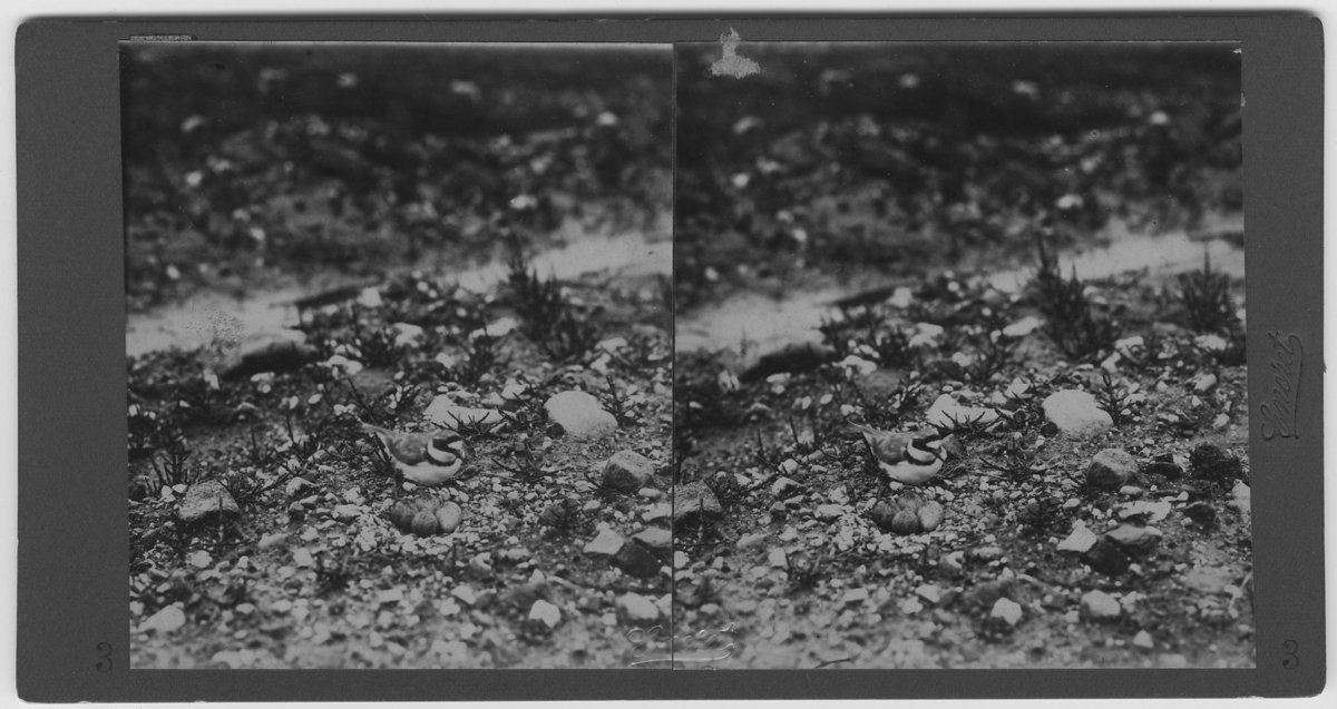 'Mindre strandpipare vid bo med 4 ägg. :: :: Ingår i serie med fotonr. 423-434. Stereoskopbilderna är numrerade 1-12 och till dem hör ett kort där det står: stereoskopbilder av danska djur och fåglar i naturen tillhörande djurläkare Roar-Christensen. Nr 1-4 mindre strandpipare, nr. 5-8 större strandpipare, nr. 9-12 svartbent strandpipare.'