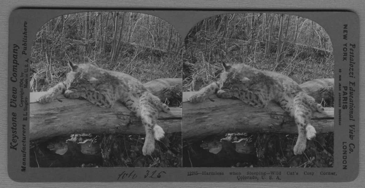 'Sovande vildkatt. :: :: ''12285 - Harmless when sleeping - Wild Cats cosy corner in Colorado, U.S.A.'' :: :: Ingår i serie med fotonr. 315-422. Se särskilt fotonr. 326-327.'