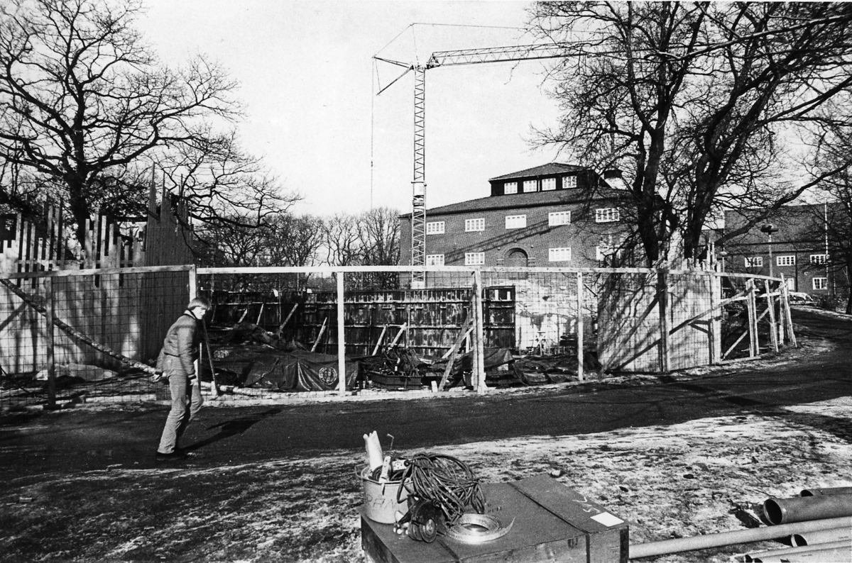 'Tillbyggnaden av Göteborgs Naturhistoriska Museum mars 1979. Foto taget mot Göteborgs Naturhistoriska Museums södra sida, över tillbyggnadsområdet. Person gående mot muséet. :: :: Ingår i serie med fotonr. 5527:69-216.'