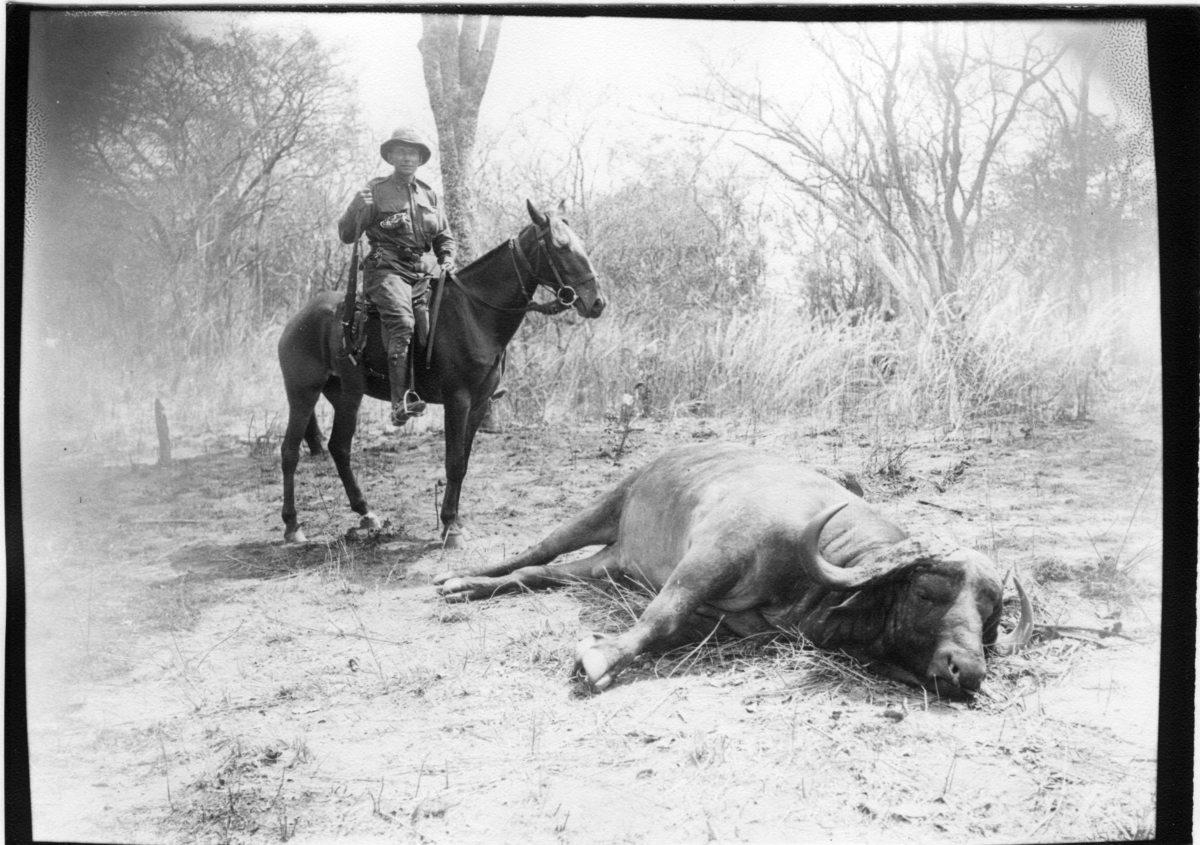 'Diverse fotografier från bl.a. dåvarande Nordrhodesia, nu Zambia, tagna av Konsul Magnus Leijer. :: :: En man sittande på en häst med gevär i handen, framför dem ligger en fälld vattenbuffel.'