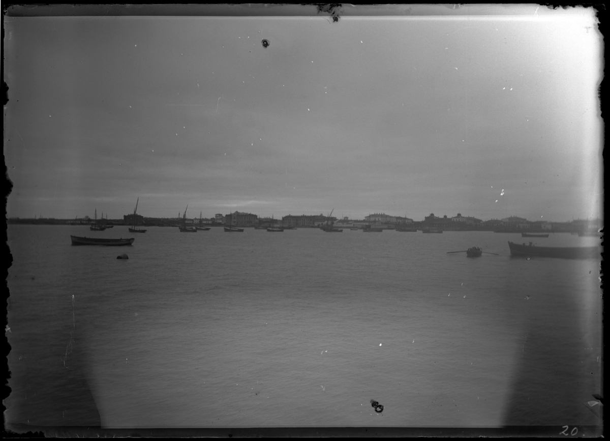 'På avstånd ev. stad med hus och byggnader. I förgrunden hav med båtar, roddbåt, eka med människor i. :: :: Ingår i serie med fotonr. 5287:1-22. Se även fotonr. 5269-5292 med bilder från Stuxbergs resa till Kaukasien.'