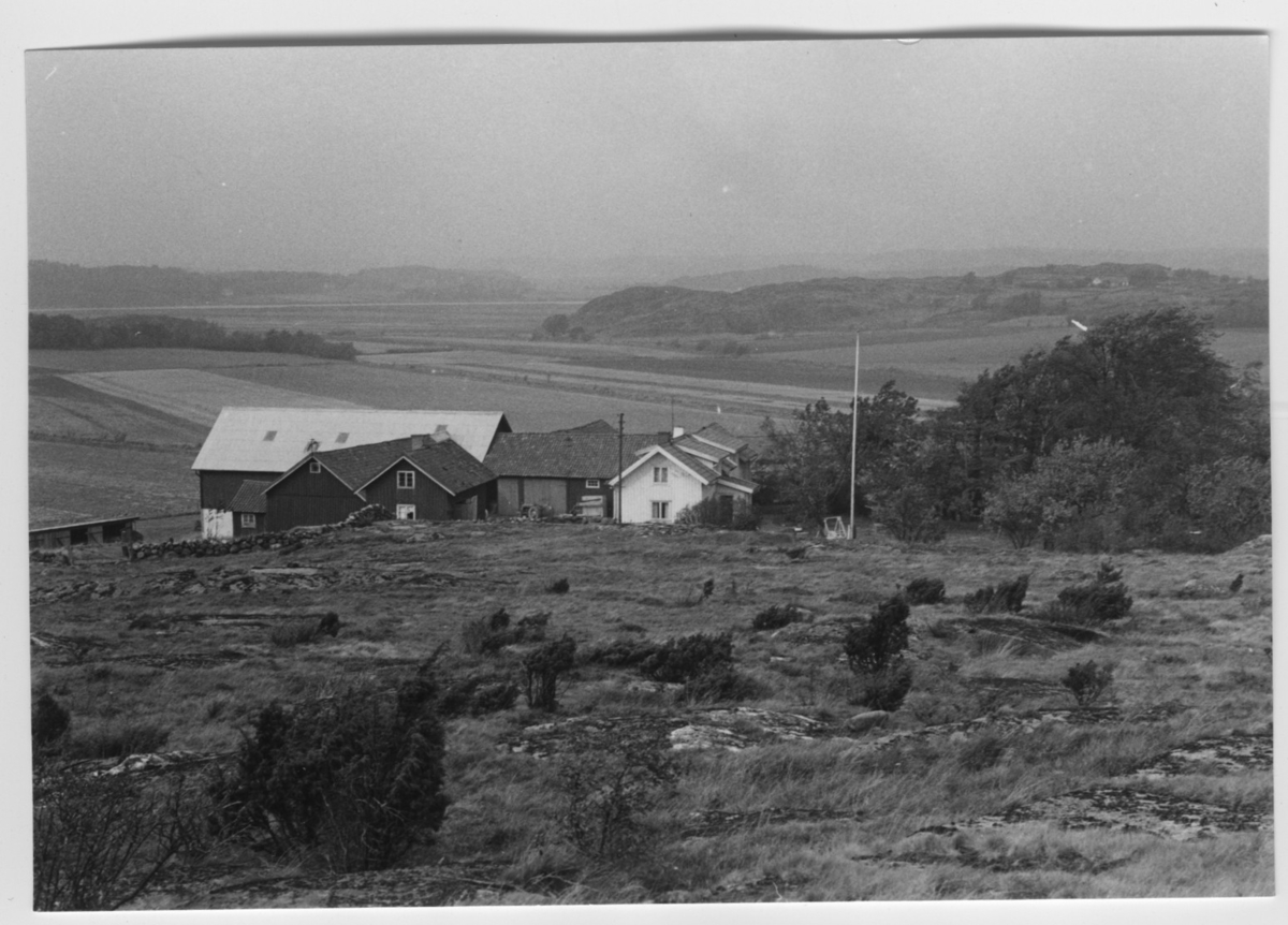 'Bildtext: ''Sedimentdalgång. Riktning 338.'' I förgrunden berghäll med gräsvegetation och enbuskar. Vy med gårdsbyggnad, traktor stående utanför. Elledning. Flaggstång. I bakgrunden öppna fält, åkrar och i fonden hus och skogsklädda berg. :: :: Ingår i serie med fotonr. 6970:1-1125, dokumentation av Hisingens naturgeografi, visande landskapsformerna i stora drag och gjord inför exploateringen av området. Platserna för fotograferingen finns utsatta på karta i skala 1:4000 som finns på Göteborgs Naturhistoriska musem. Fotoriktningen mättes med kompass i gammalgrader.'