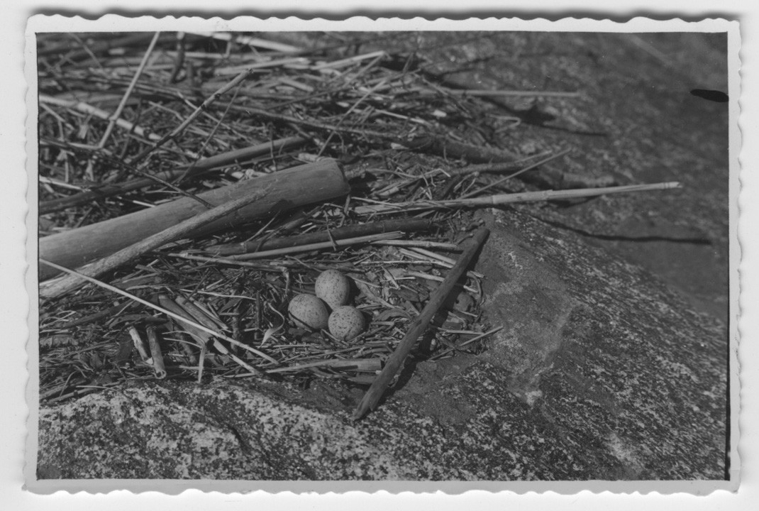 'Bo med 3 ägg av mindre strandpipare, närbild. Boet på berghäll? :: :: Se serie med fotonr. 3650-3660.'