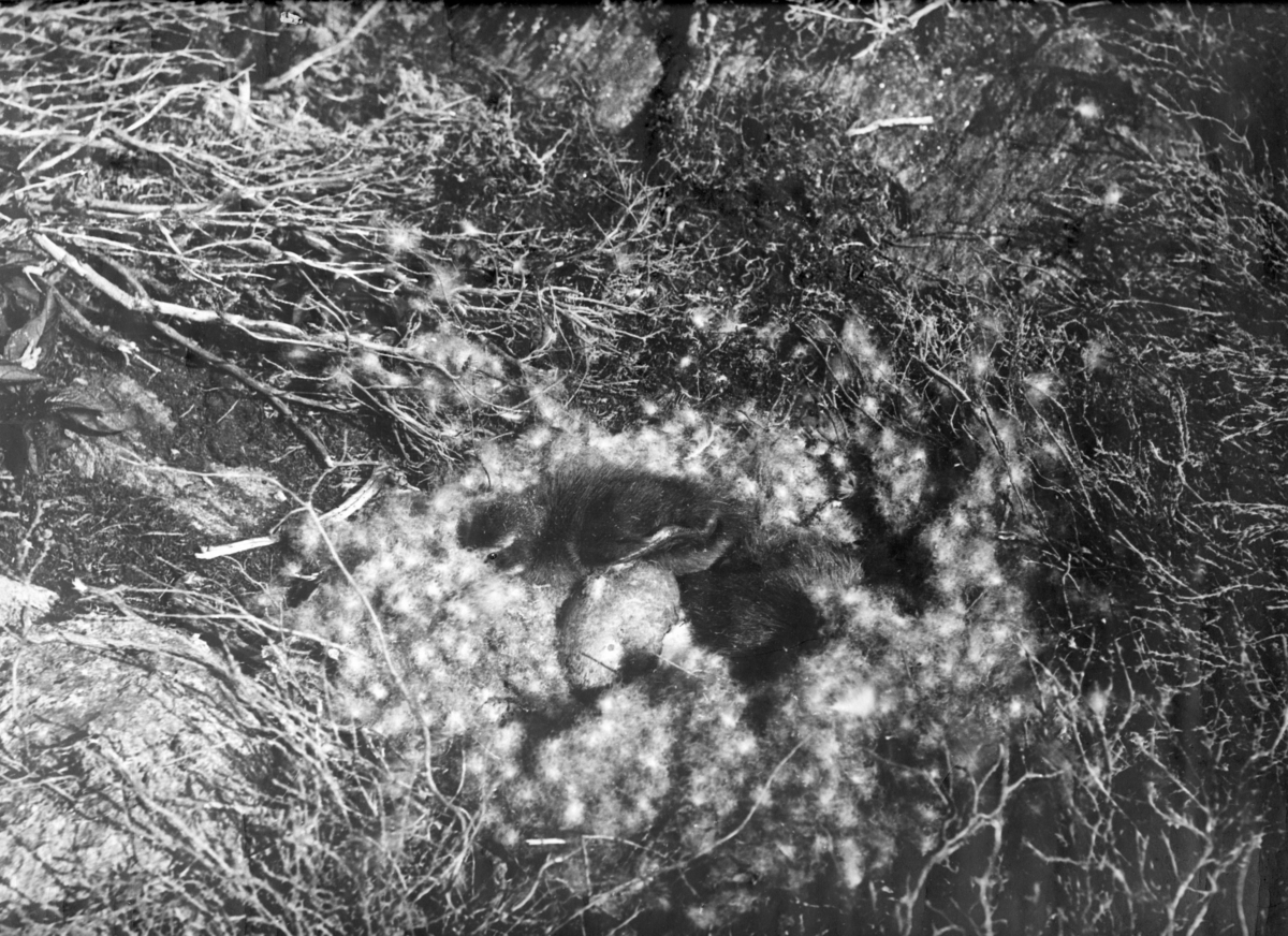 'Bildtext: ''Ejderrede från norra Bockholmen, Holma. (två ungar, ett ägg inte kläckt). :: Närbild på ejderbo med 2 ungar samt 1 ägg. Dun. Boet bland ljung.'