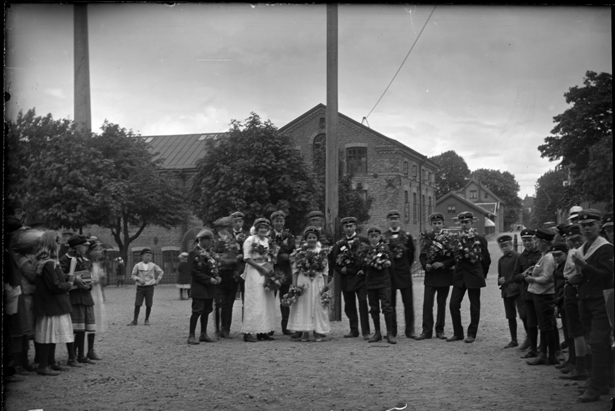 'Folksamling, ca 30 flickor och pojkar samlade på öppen yta framför tegelbyggnad. Ca 12 personer varav 2 flickor stående tillsammans i grupp och håller buketter i händerna samt iklädda kransar runt halsen. Uppklädda, finklädda iklädda mössor. Skolavslutning? Examen? :: :: Ingår i serie med fotonr. 5137 med diverse bilder. Plåtarna ligger i 2 pappaskar. På asken för negativen 9x12 cm och 12x18 cm står texten: ''Fröken Pettersson, Eksjö. Kopieras. Negativ. Alingsås samskola? m.m.'''