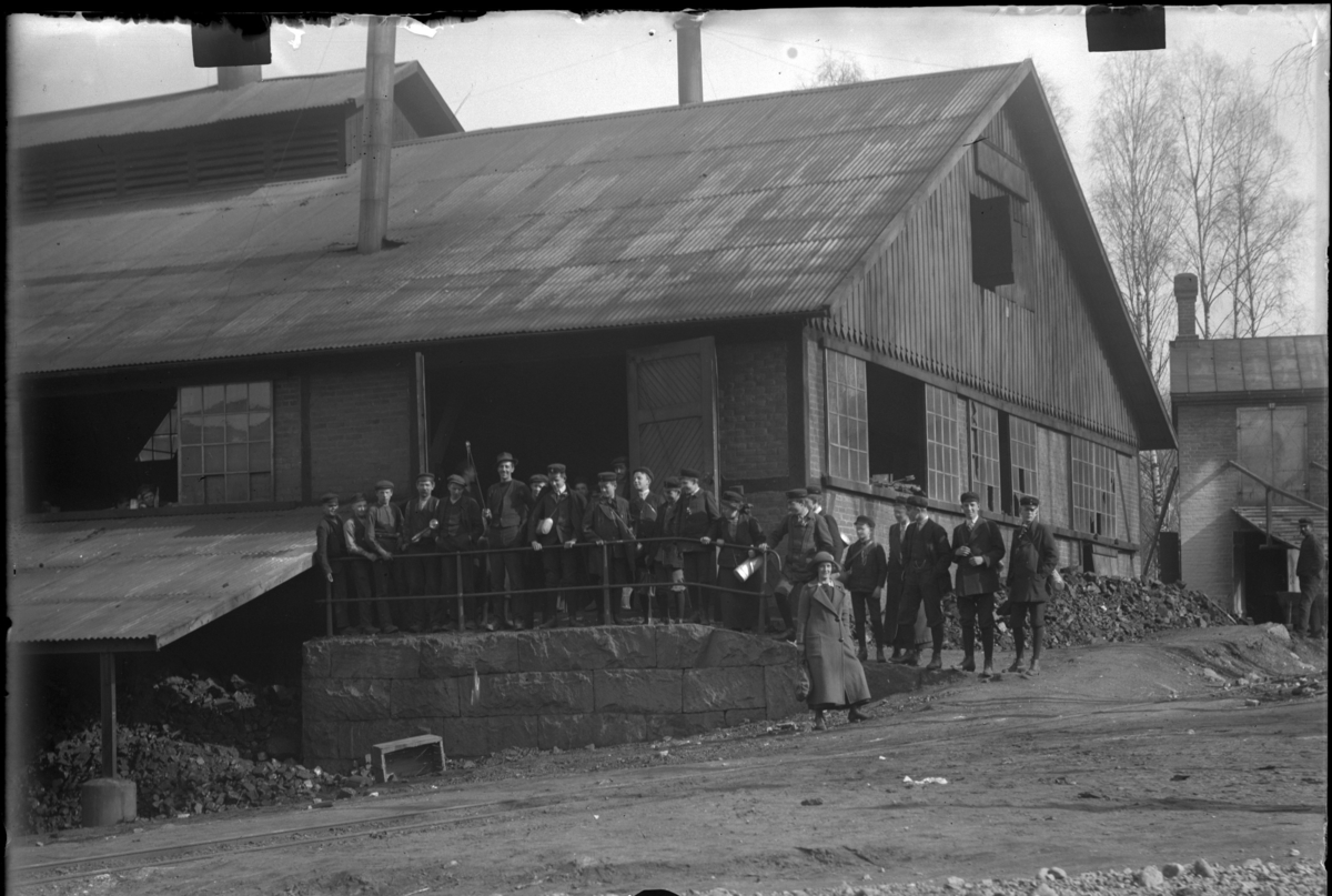 'Gruppbild. Ca 24 unga män, pojkar iklädda skärmmössor, kepsar, samt 1-2 kvinnor samlade framför ekonomibyggnad, gårdsbyggnad i tegel och trä. Kvinnorna med väskor och hatt. Pojkarna bärande väskor. I bakgrunden ytterligare 1 pojke. Ett huvud av 1 pojke sticker ut genom ett fönster i byggnaden. :: :: Ingår i serie med fotonr. 5140:1-39.'