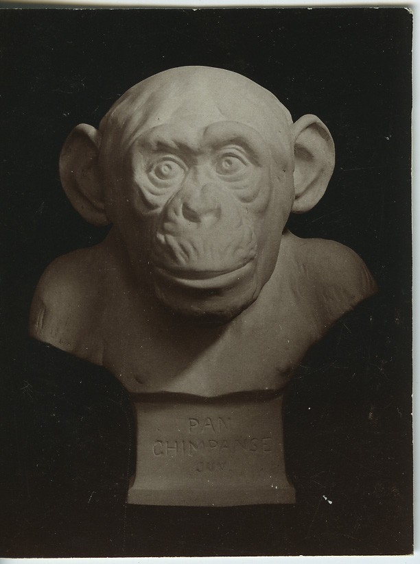 'Schimpans, juv. Skulptur av Bildhauer Herman Teer Meer, Leipzig. Höjd 28 cm. :: :: Ingår i serie med fotonr. 1015-1020.'