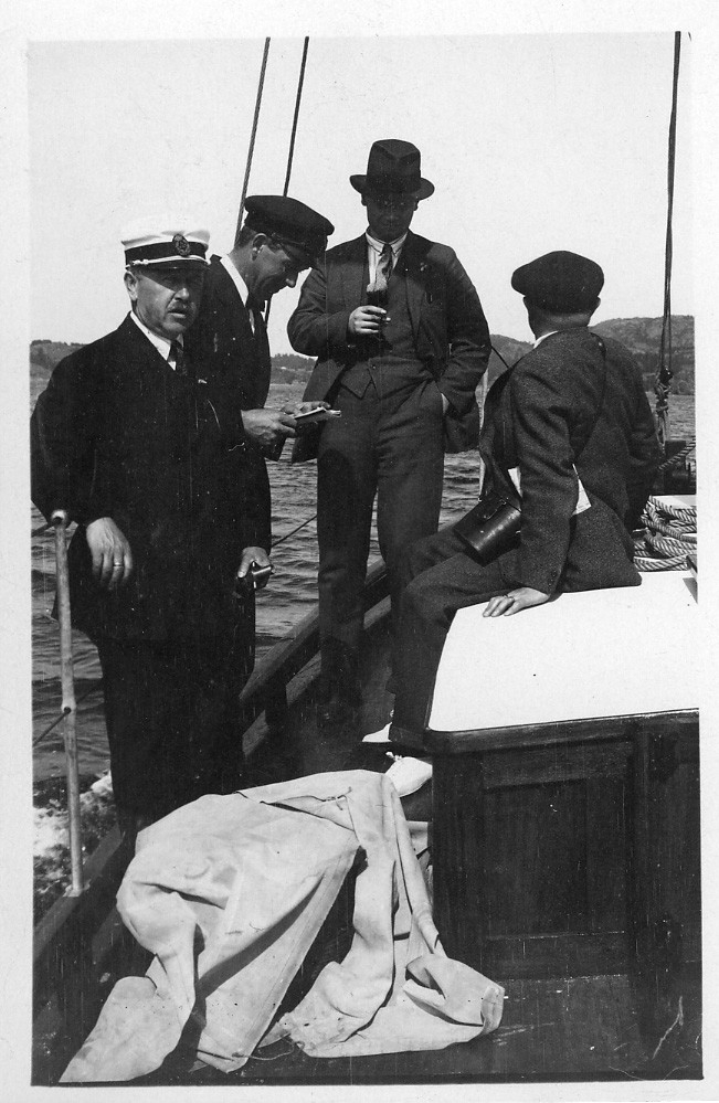 'Från motorbåten ''Akkas'' provtur, :: 4 män på däck.'
